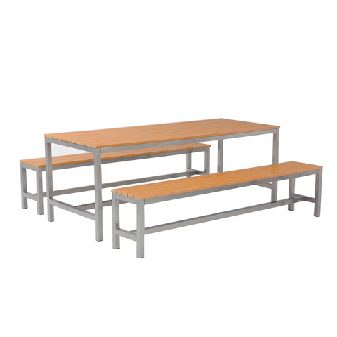 Juego de mesa de madera y plástico WPC personalizado para exteriores, mesa de Metal y bancos, juego de sillas